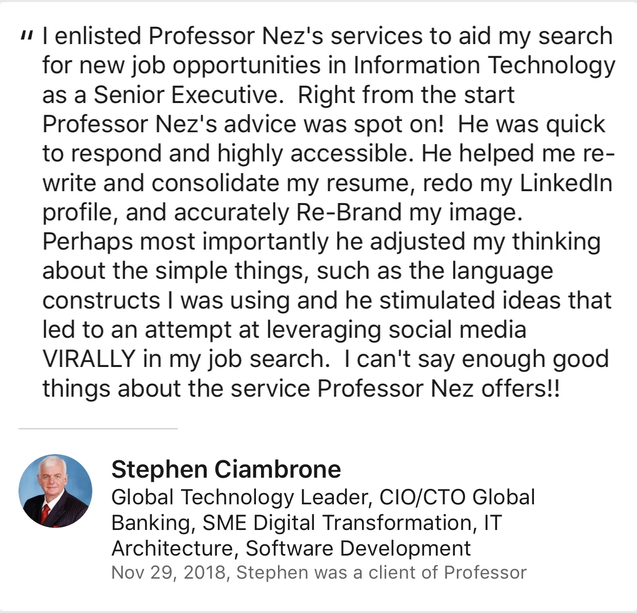 Please watch the video below as I go in depth with my process and how I operate. Please don't overlook the testimonials and reviews below as well. I have the most current on LinkedIn out of any Executive Career Coach and Resume Writer. I am more than happy to set up a complimentary phone conference for 15 minutes to discuss your situation and answer any questions.